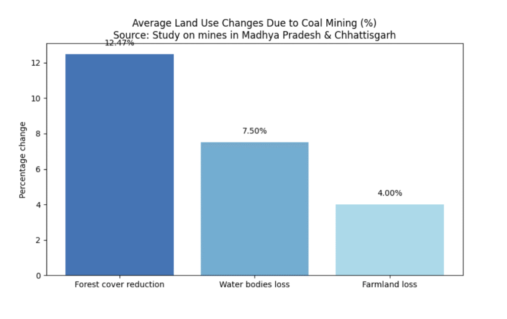 Drawing on the Mongabay study of three mines in Madhya Pradesh and Chhattisgarh, the bar chart below summarises average changes in land use: forest cover declined by about 12 %, water bodies shrank by 7.5 %, and farmland reduced by 4 %.